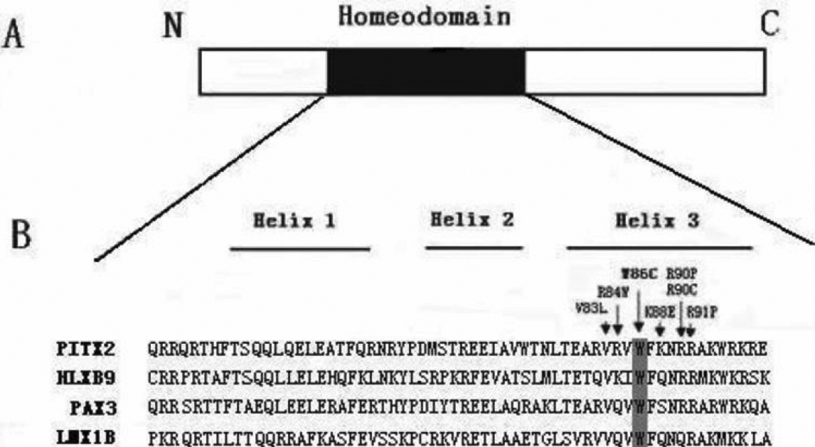 Figure 4. Schematic diagram of PITX2a and amino acid sequence alignments of PITX2 homeodomain with other homeodomain proteins. A: The structure of the PITX2a isoform. The black region represents the homeodomain (HD). B: Alignments of the human PITX2 homeodomain and related homeodomain-containing proteins (the three α-helices are also indicated)