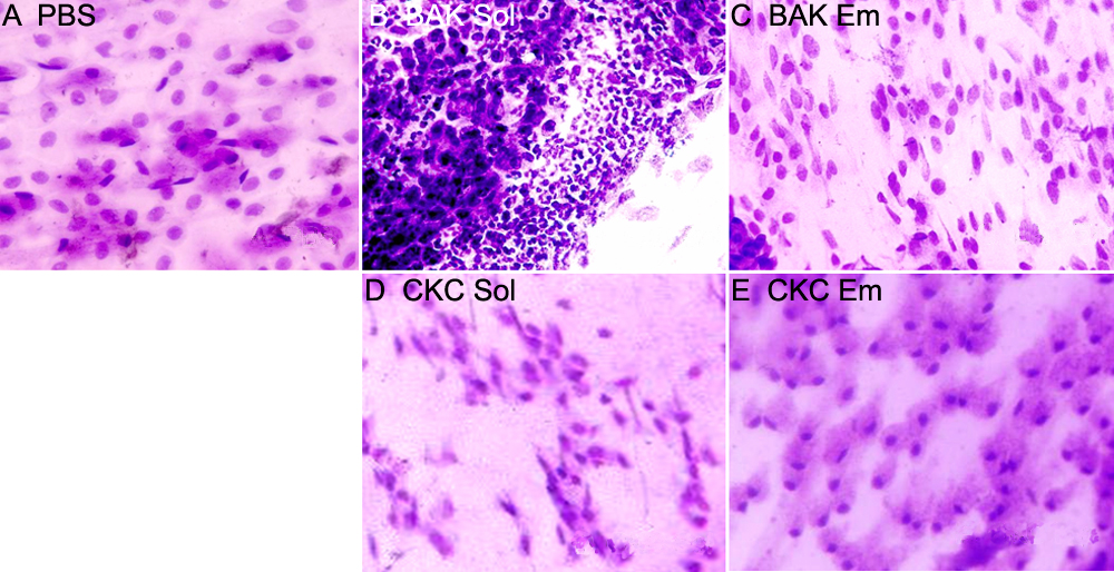 Figure 5. Conjunctival impression cytology stained by cresyl violet at D1. PBS (A) presented normal aspects of the conjunctival epithelium with no inflammatory infiltration. BAK Sol (B) induced numerous polymorphonuclear inflammatory cells with almost no normally shaped epithelial cell visible. BAK Em (C) and CKC Sol (D) both showed epithelial damage with inflammatory infiltration. CKC Em-instilled (E) rabbit eyes presented normal epithelial patterns without inflammatory infiltration. (original size 40×).