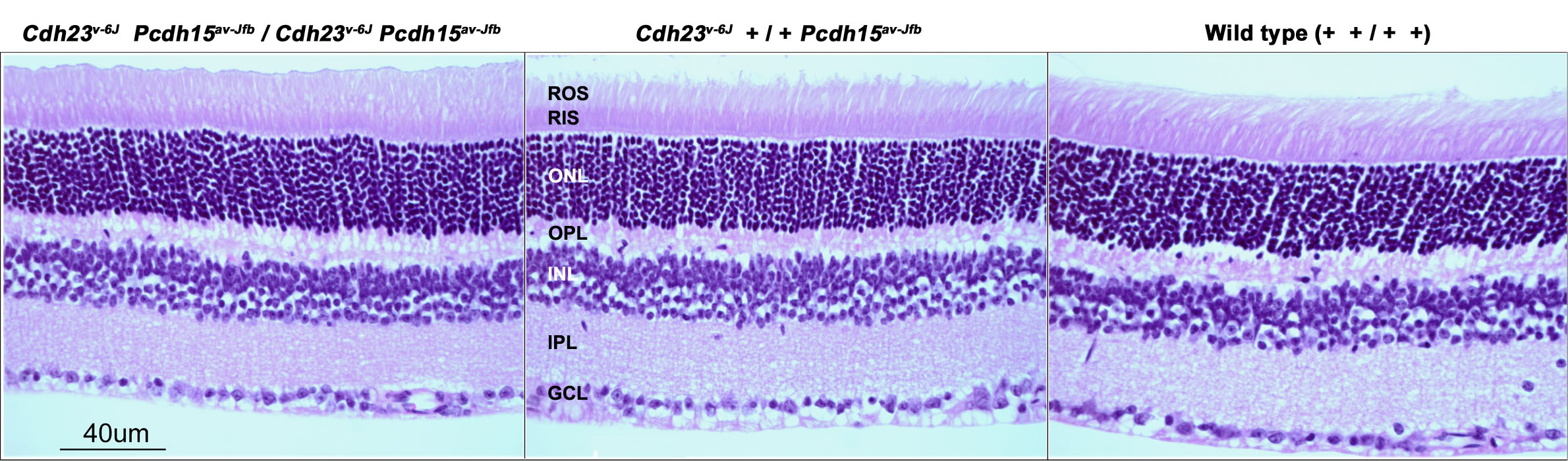 retinal morphology of a wild-type, a double heterozygous (+ +/Cdh23v-6J