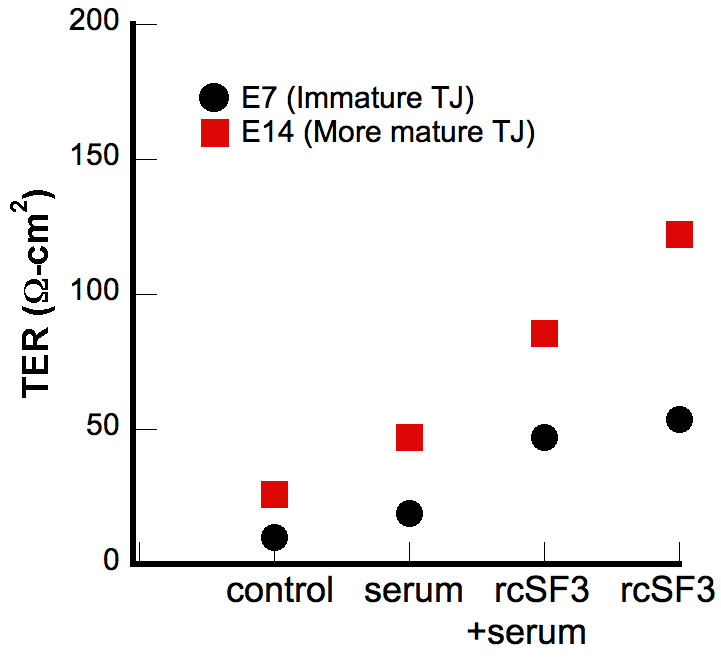 Figure 1. The transepithelial electrical resistance (TER) of cultured RPE is affected by serum and embryonic day 14 (E14) retinal conditioned