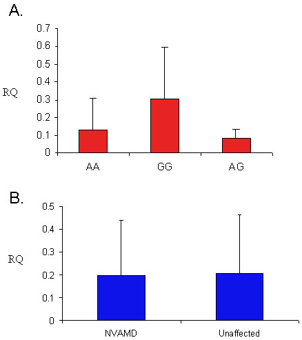 between the three groups were not significant (p>0.1 for each comparison). B: Shown are mRNA levels of HTRA1 in 22 NVAMD patients and 5 unaffected individuals (p=0.9). In both A and B, RQ represents relative HTRA1 mRNA levels. Error bars represent standard deviation (SD).