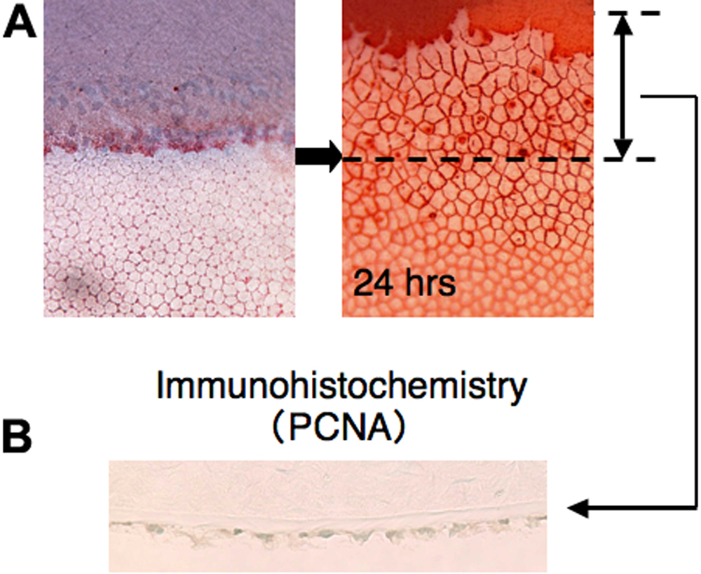 path on the denuded area was measured. B: The spreading sheet of the endothelial cells lacks proliferating cell nuclear antigen