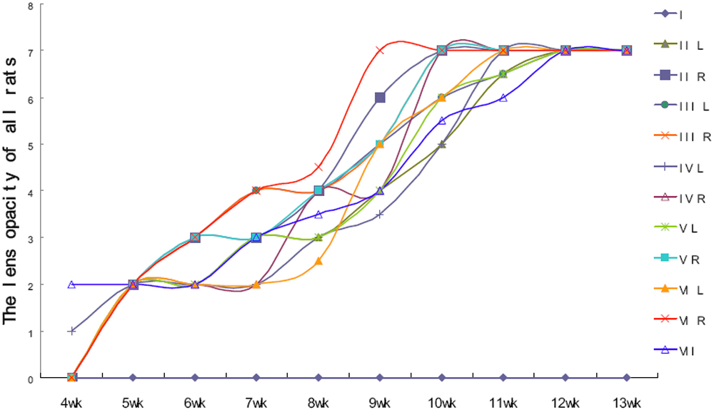 Figure 2. Lens opacity of all groups on difference experimental periods. All of the diabetic rats developed cataracts more or less at