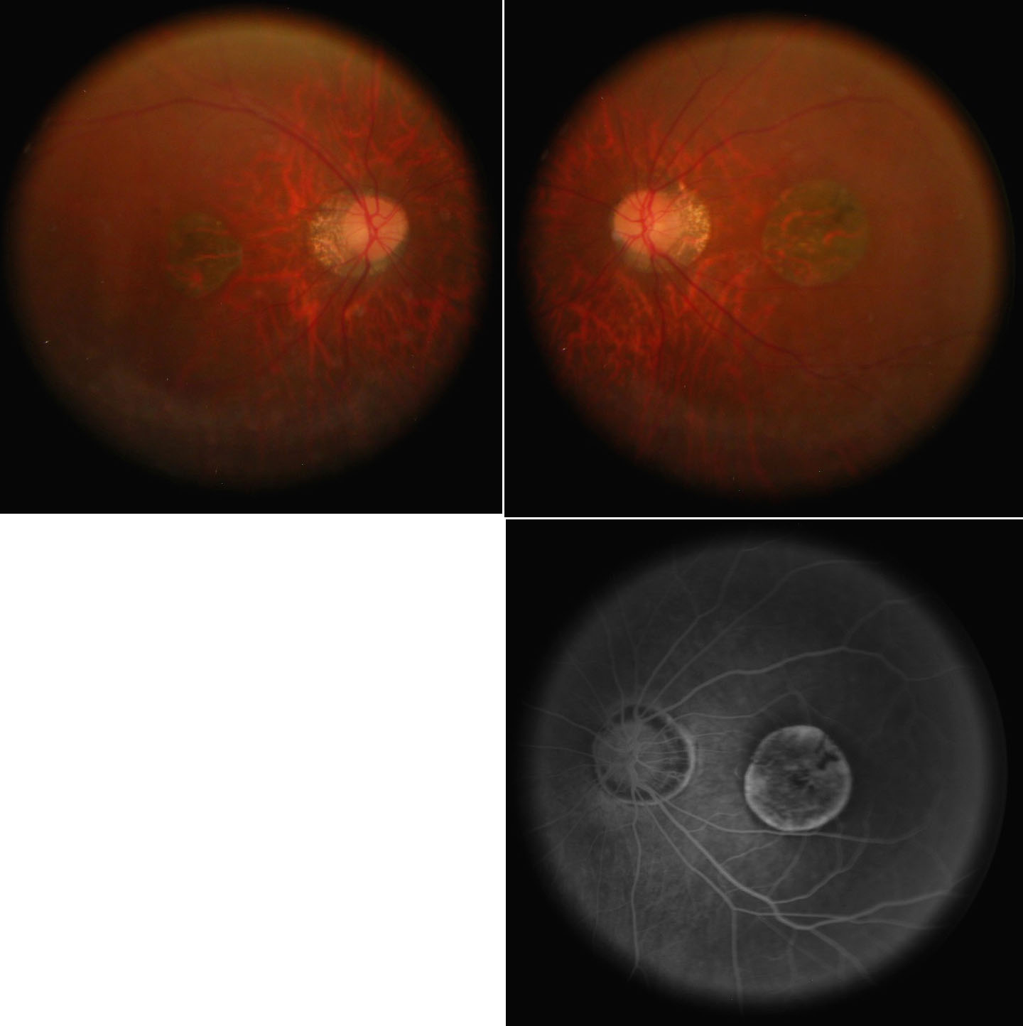 left: OD; top right: OS) and an angiography picture (bottom right: OS)