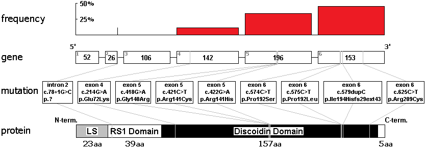 Figure 2. Identified mutations, their frequency in the RS1 gene, and the retinoschisis protein. In the gene diagram, exons are represented by bars (gray numbers indicate their numbers;