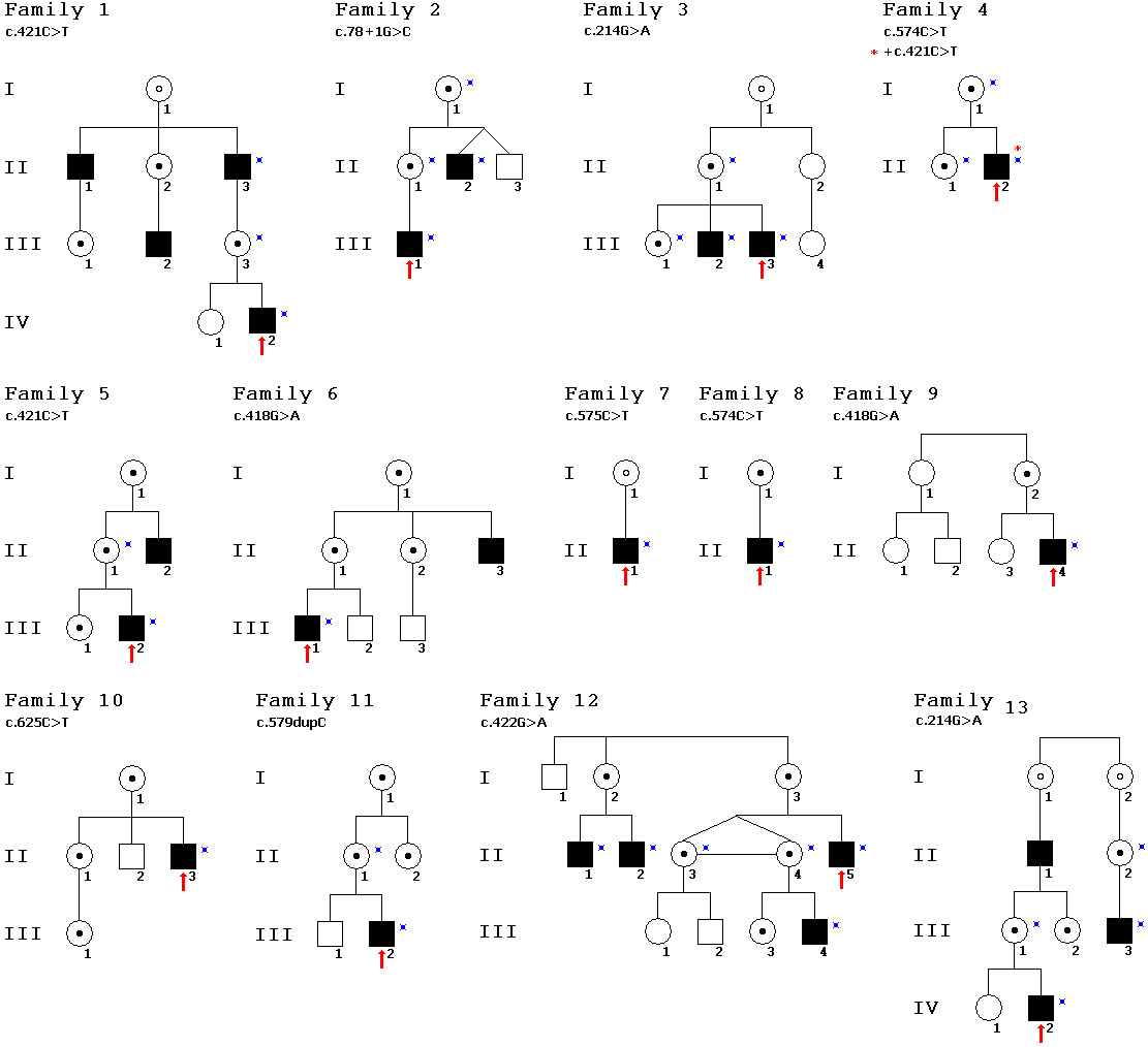 Figure 3. Pedigrees of 13 Hungarian families with XLRS and identified mutations in the RS1 gene. Black boxes represent affected males,