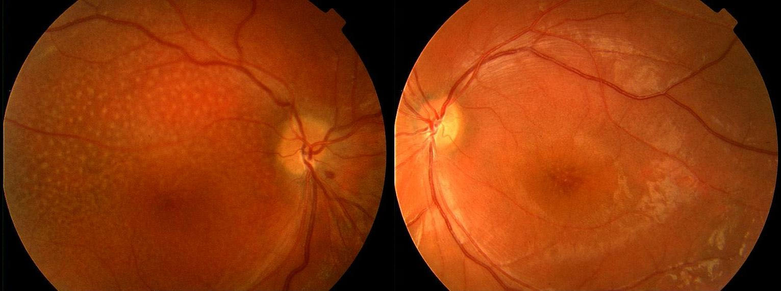 gene. Huge foveal schisis in both eyes and pronounced white flecks,