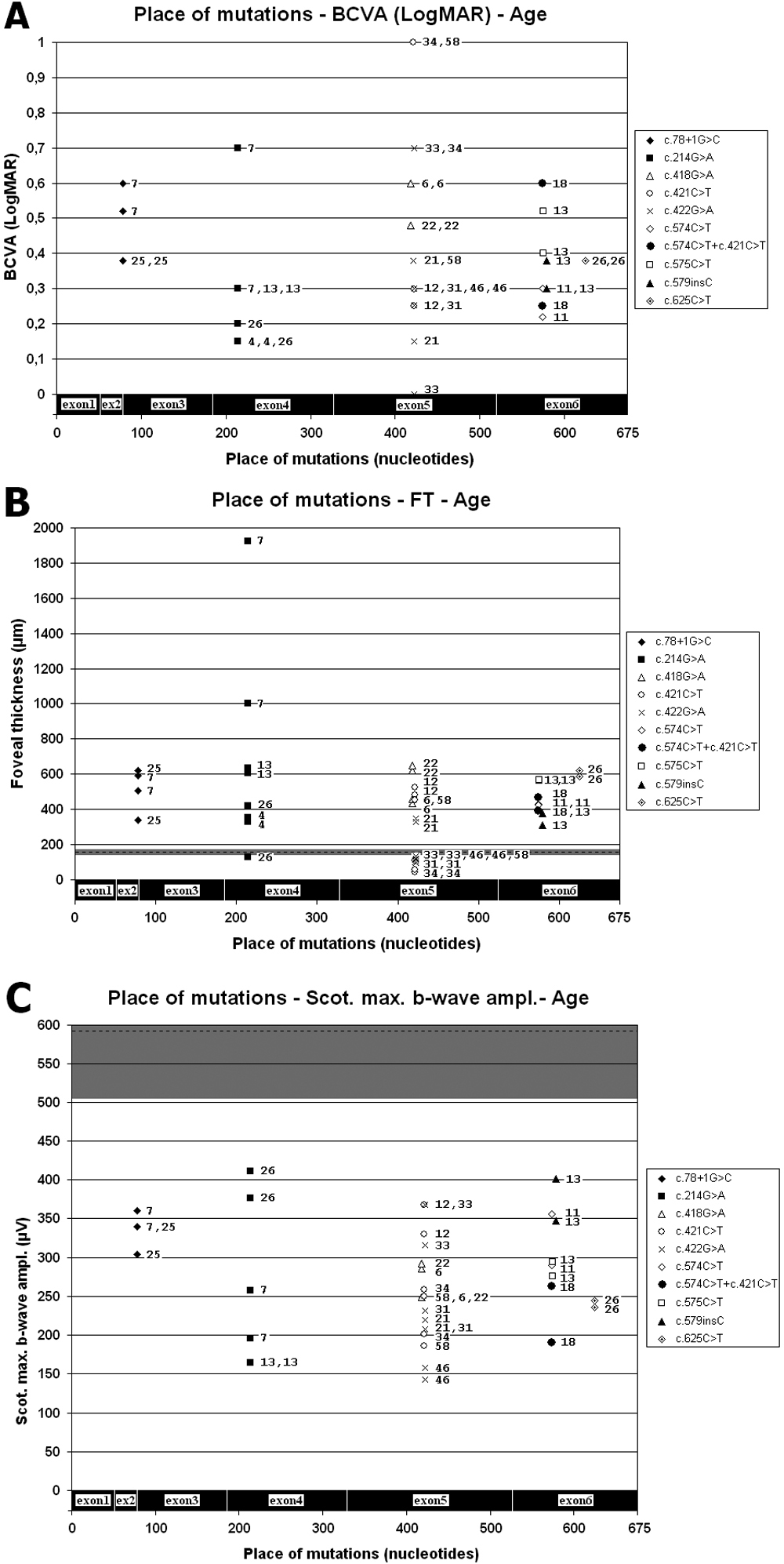 Figure 8. Distribution of different mutations with relevant BCVA (A), FT (B), standard combined b-wave amplitudes of full field ERG (C), and age. Age (yrs) is showed by numbers beside symbols characterizing the type of mutations in each eye. Mean values of