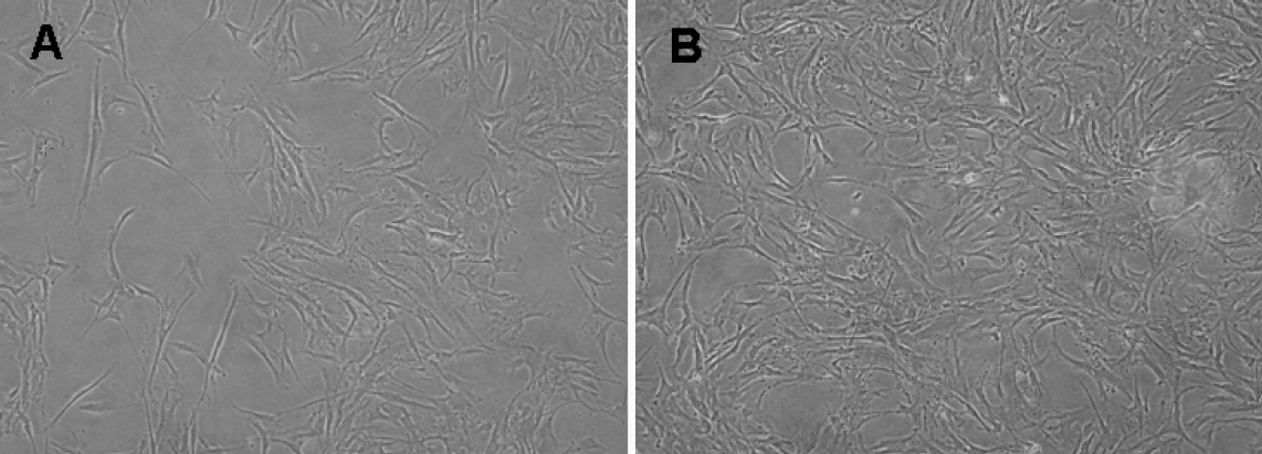 incubation (A) whereas incubation with 100 ng/ml rhBMP-2 changed the HSFs into the intensive and polygonal cells (B). Inverted phase contrast microscope, original magnification 100X.