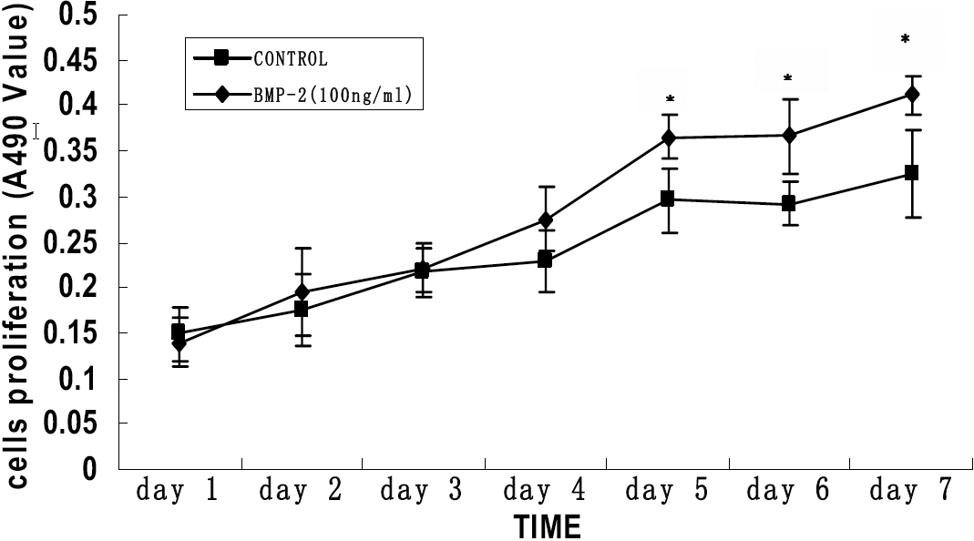 cells were incubated with no rhBMP-2 or 100 ng/ml rhBMP-2 for seven days. A significant difference was seen in cell proliferation