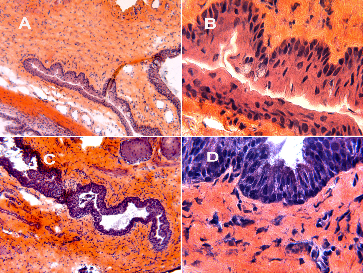 Figure 1. Histological micrographs. Conjunctiva in control rats with 10X (A) and 50X (B) enlargement. Conjunctiva in endotoxin-induced uveitis (EIU) 24 h after LPS injection with 10X (C) and a 50X (D) enlargement showed a disorganization of the epithelial architecture with an increase in the number of layers and the size
