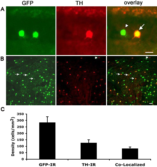 29±2% of GFP-labeled cells coexpressed TH. Scale bar equals10 μm for A