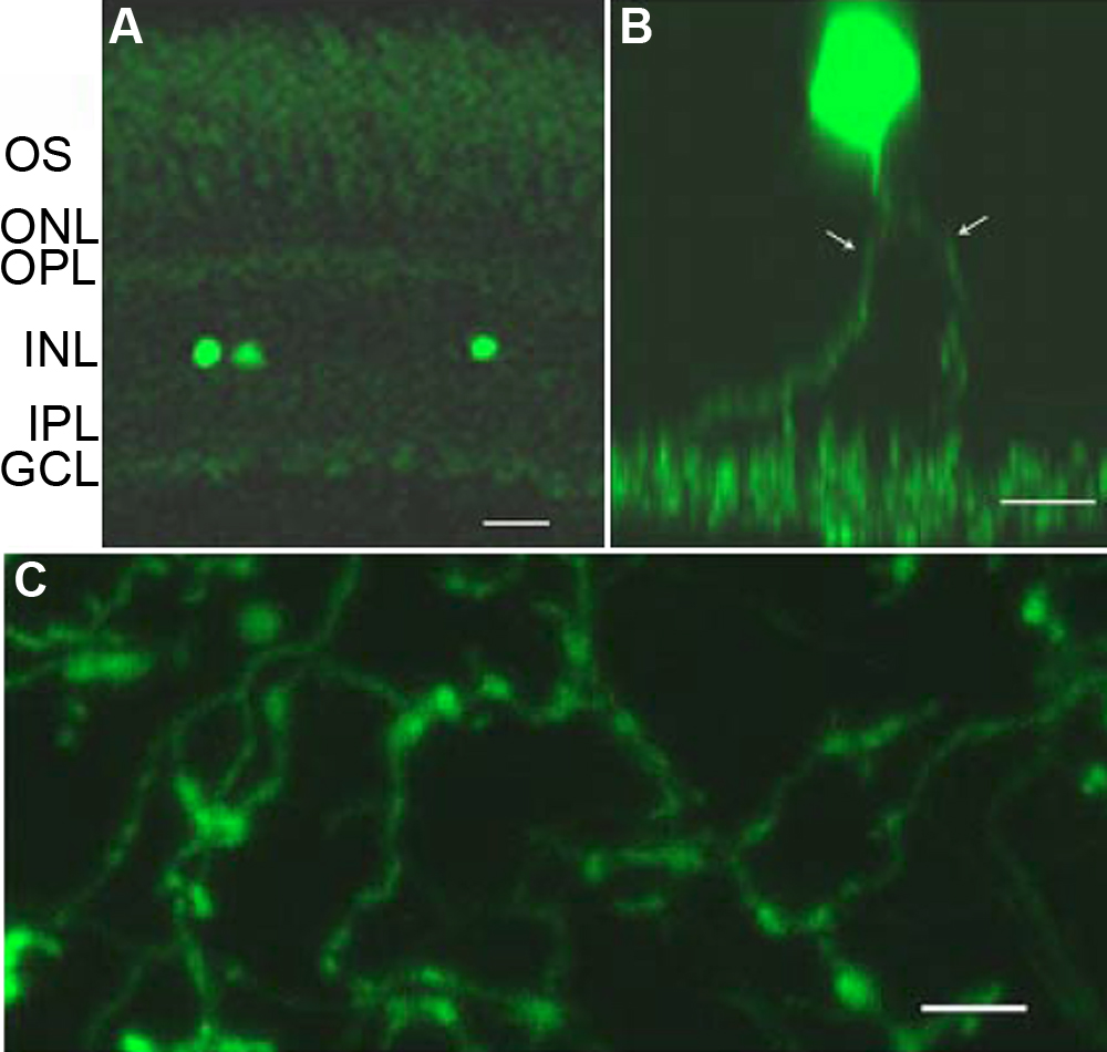 layer (OPL); INL: inner nuclear layer; IPL: inner plexiform layer. B: This z-stack image shows the somata and processes of a single cell. C, GFP fluorescent fiber network in the inner plexiform layer. Scale bar equals 20 μm for A and C, and 10 μm for B.