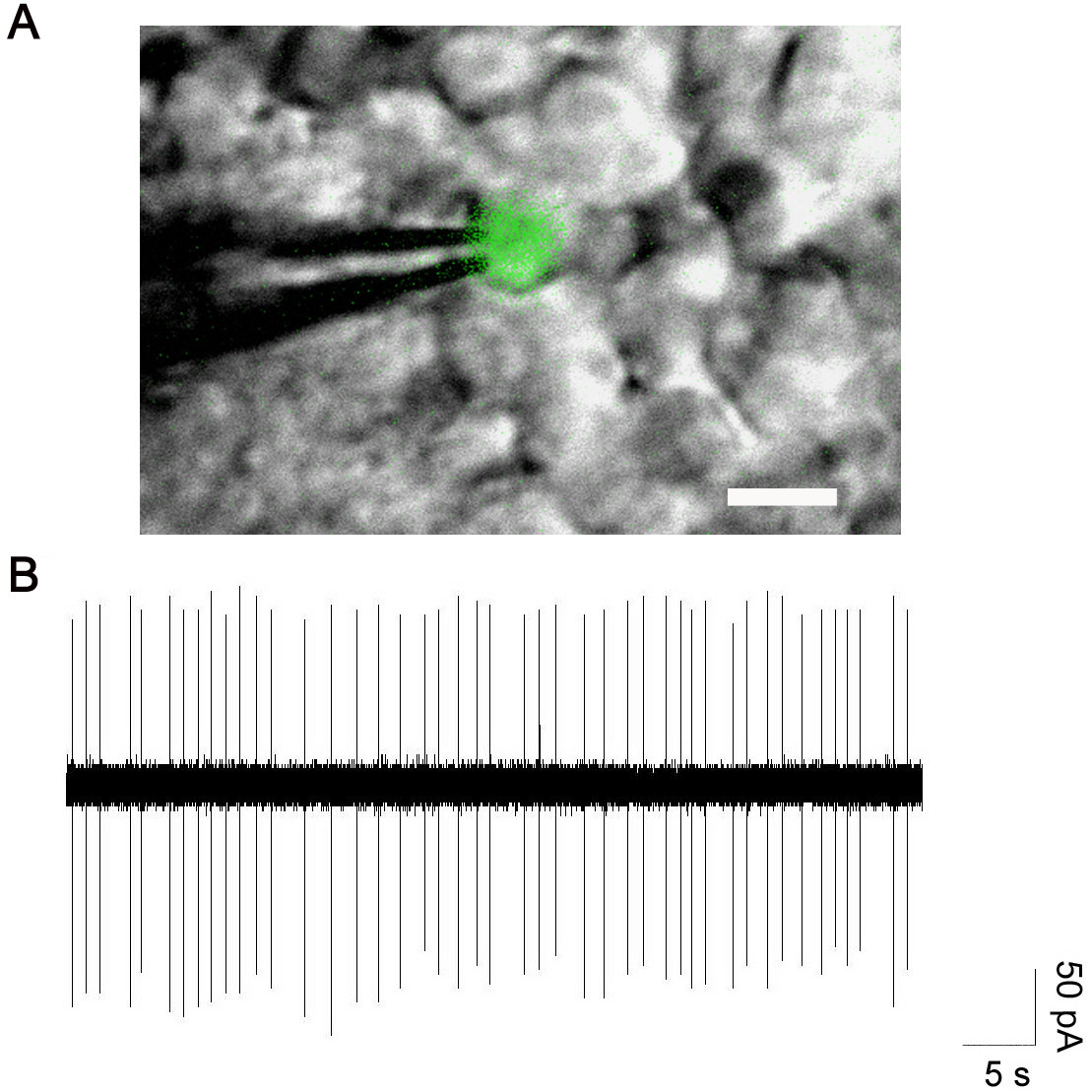 a Tg(−12th:MmGFP) neuron and recording electrode in a whole mount zebrafish retina is shown in panel A. Scale bar equals 10 μm. Panel B displays spontaneous spikes recorded in a GFP-labeled cell. Loose-patch recordings were made using a voltage-clamp mode with