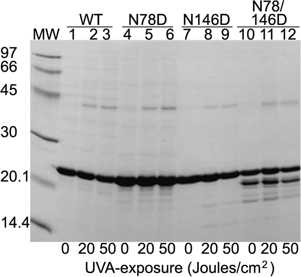 of varying doses (0, 20, and 50 J/cm2, shown at the bottom of the gel), the WT αB-crystallin and its three deamidated mutant proteins (αB-Asn78Asp, αB-Asn146Asp,