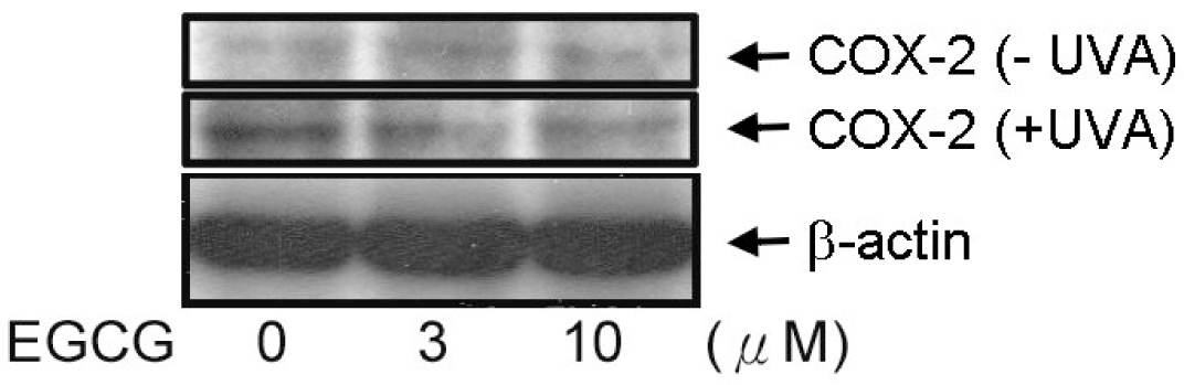 Effect of EGCG on UVA-induced COX-2 expression. ARPE19 cells were preincubated with EGCG for 2 h then exposed to 20 J/cm