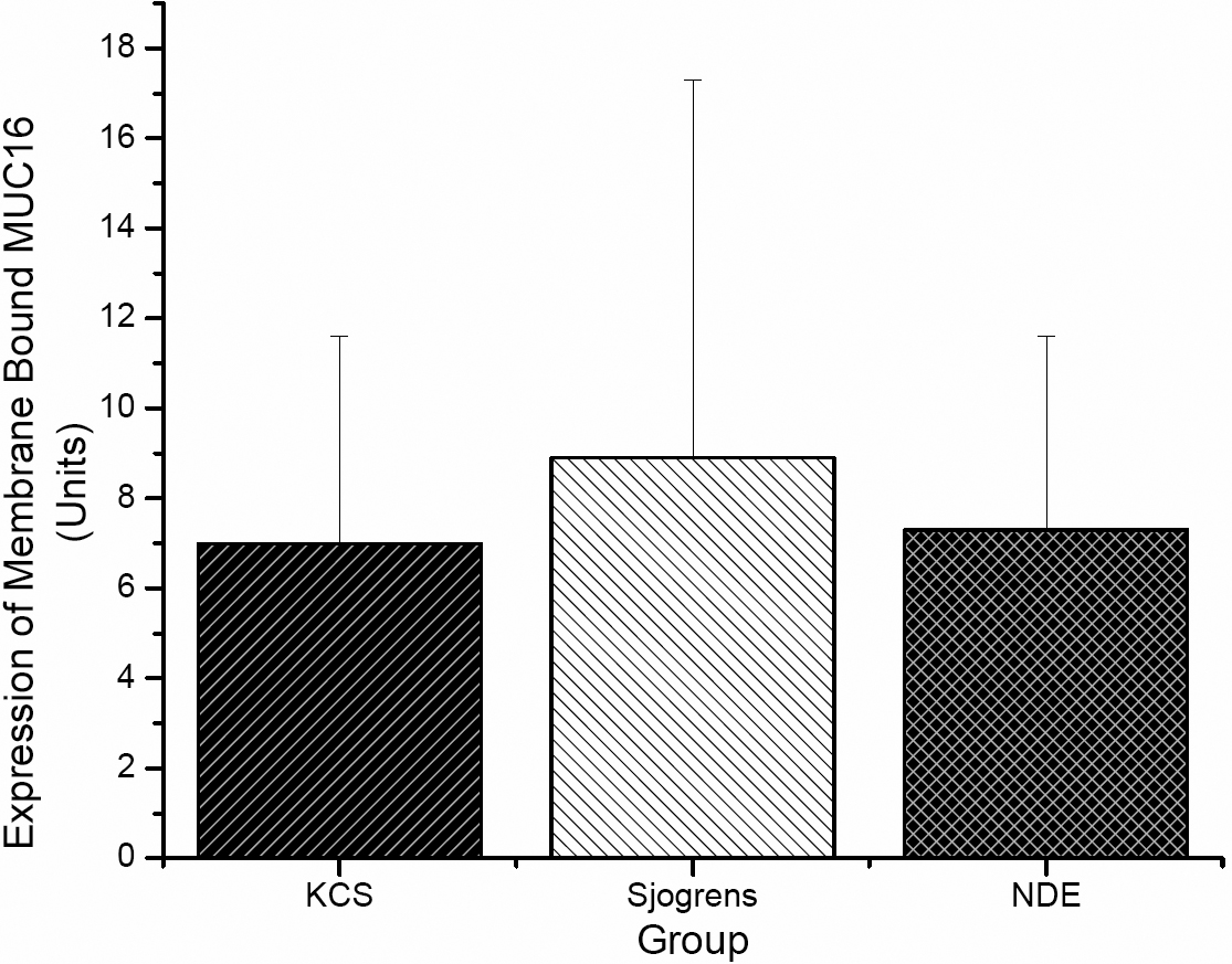 Summary of membrane bound MUC16 as quantified by western blotting. Protein samples collected via impression cytology. MUC16 data expressed in Units as calculated from extrapolation from a standard curve made from titration of CA125.