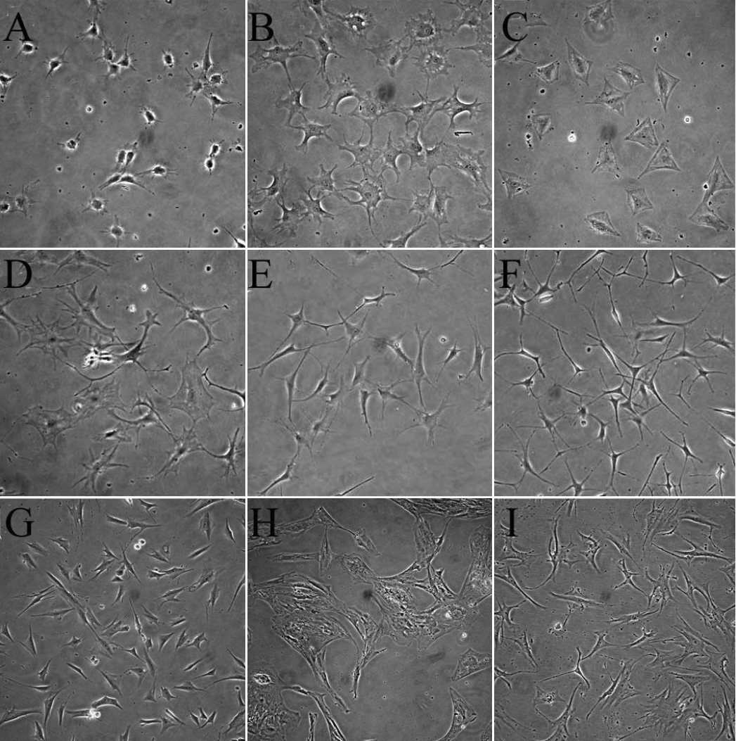 cells to finally assume myofibroblastic morphology (B, C). The addition of TSA suppressed the differentiation mediated by fetal bovine serum (D) and TGFβ (E, F), and the inhibition was dose-dependent as shown in (E; 100 nM TSA) and (F; 400 nM). Human quiescent corneal keratocytes (G), TGFβ induced the differentiated myofibroblasts (H), and 400 nM TSA treated corneal fibroblasts (I) exhibited similar morphological changes. (200X)