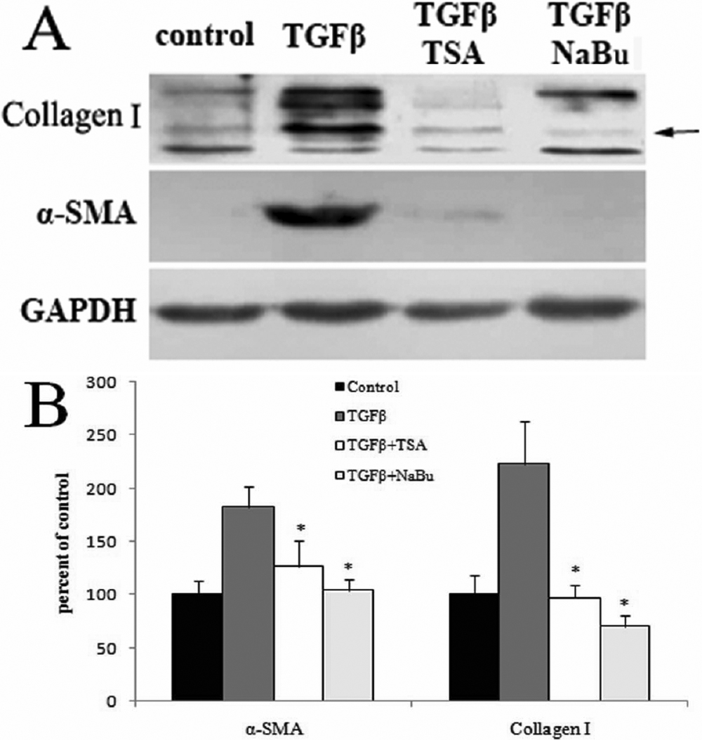 Figure 4. TSA and NaBu suppressed the TGFβ-mediated upregulation in the expression of collagen I and α-SMA at the protein levels. As