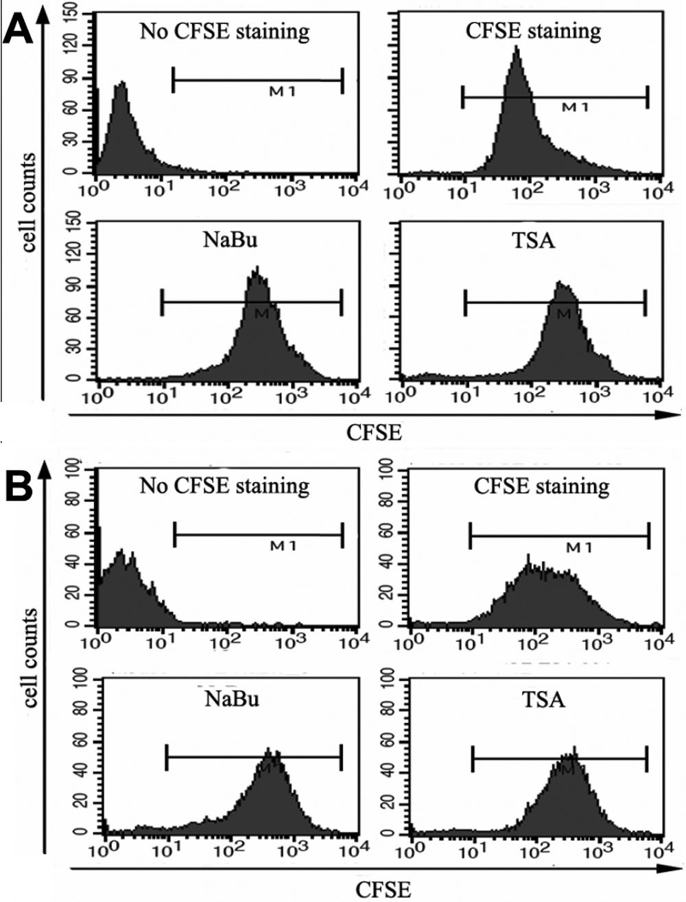 the fluorescent dye CFSE and analyzed by FACS. Loss of CFSE fluorescence reflects cellular division.