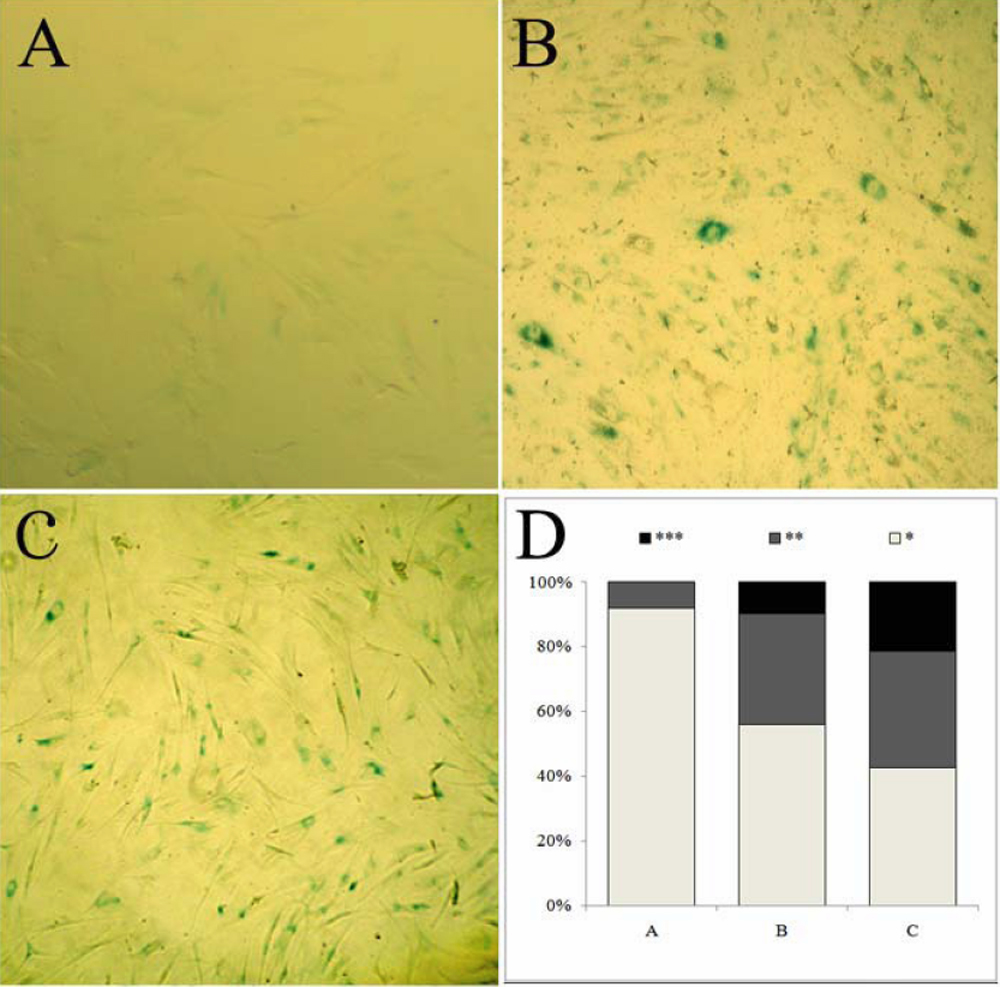 reduced saturation densities in corneal fibroblasts and more prominent β-galactosidase activity (B) than the untreated cells of equal density (A), while the positive control cells (treated with 100µM H2O2) showed enhanced staining of β-galactosidase (C). D: Image quantitative analysis of different β-galactosidase staining densities; the number of asterisks represents different