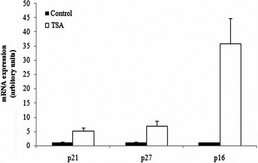 senescence. Compared with the untreated cells, the expressions of p16ink4a, p27kip1 and p21cip1/waf1 were upregulated by 35.85, 6.98, and 5.15 fold, respectively, by TSA.