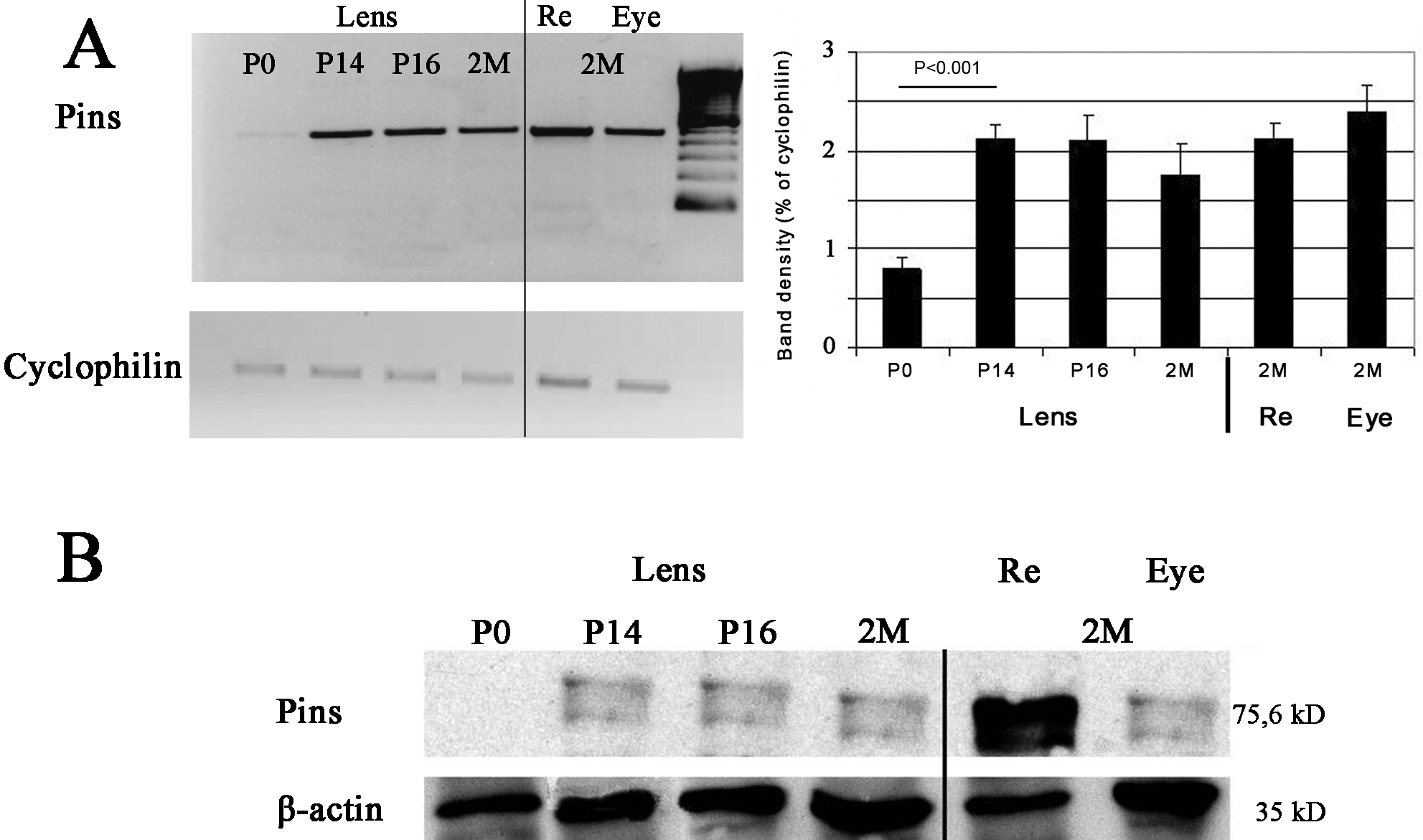 levels of mPins mRNA in the lens at the P0 stage. These levels