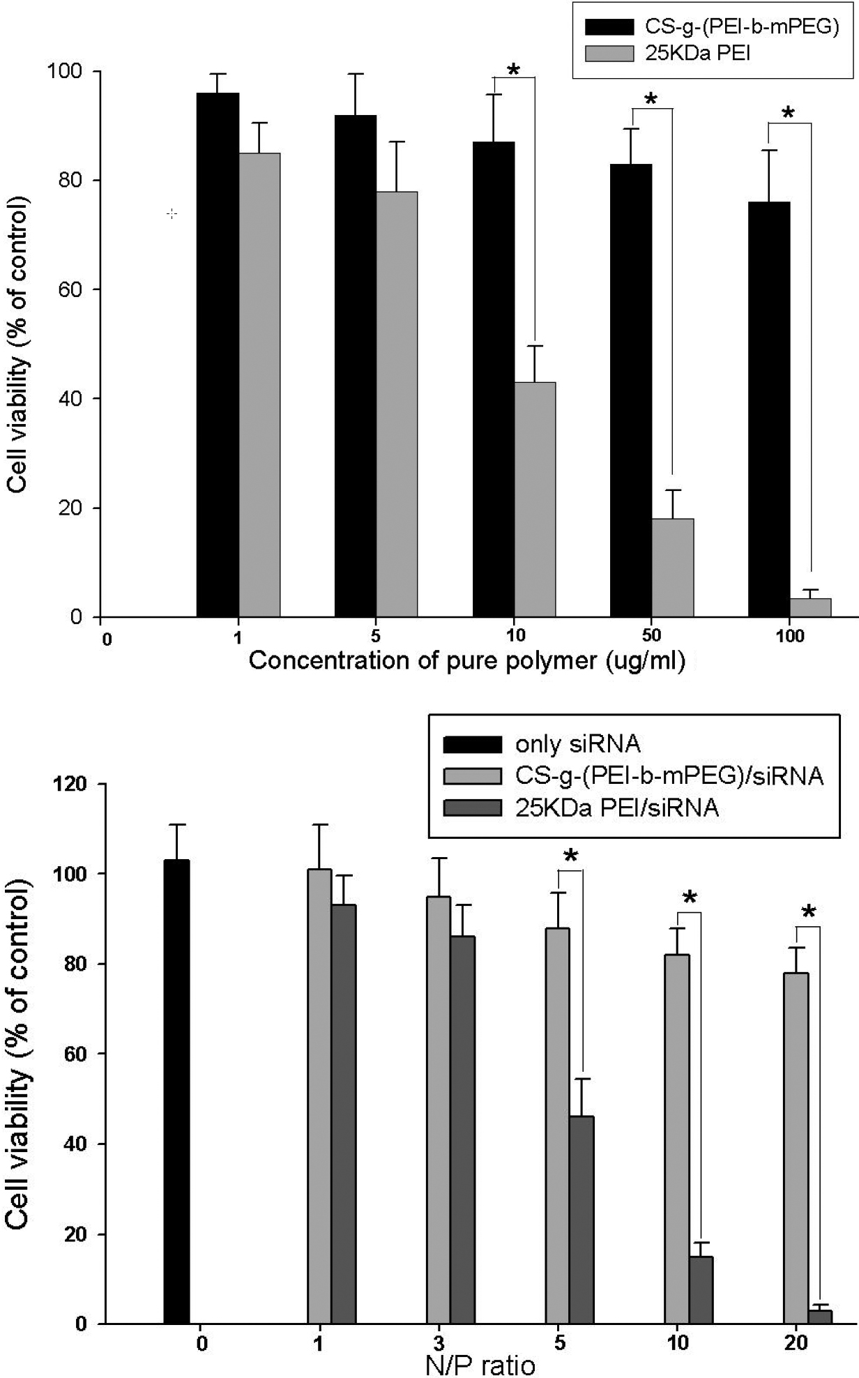 Figure 7. Cytotoxicity of CS-g-(PEI-b-mPEG) and 25 kDa PEI at various concentrations of pure polymers and complexes with siRNA at determined N/P ratios. Pure CS-g-(PEI-b-mPEG) copolymer did not exhibit significant cytotoxicity at any determined concentration, and after compacting with siRNAs,