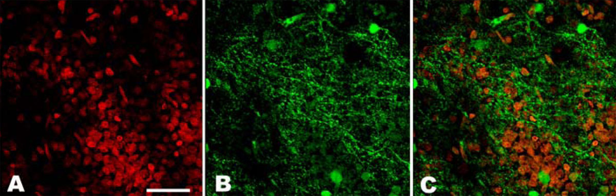 representing photoreceptor axons and dendrites. Panel C is a double staining exposure of the nuclei and cGMP. Scale bar represents