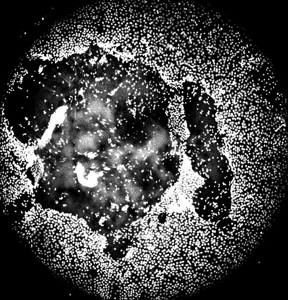 Figure 7. Loss of surface LEC by death and by abnormal migration in the x-ray cataract. This confocal view shows the loss of surface