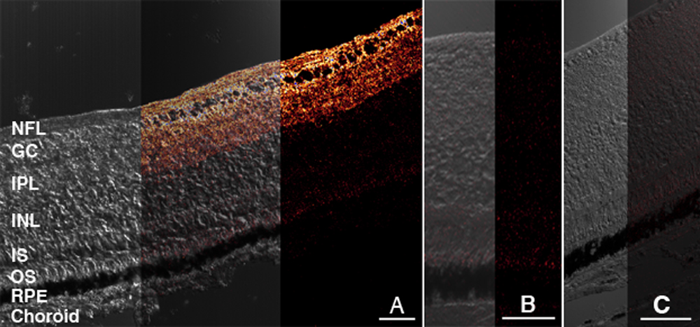 retina merged (in middle) with the accompanying differential interference contrast image (to the left) is shown. The layers