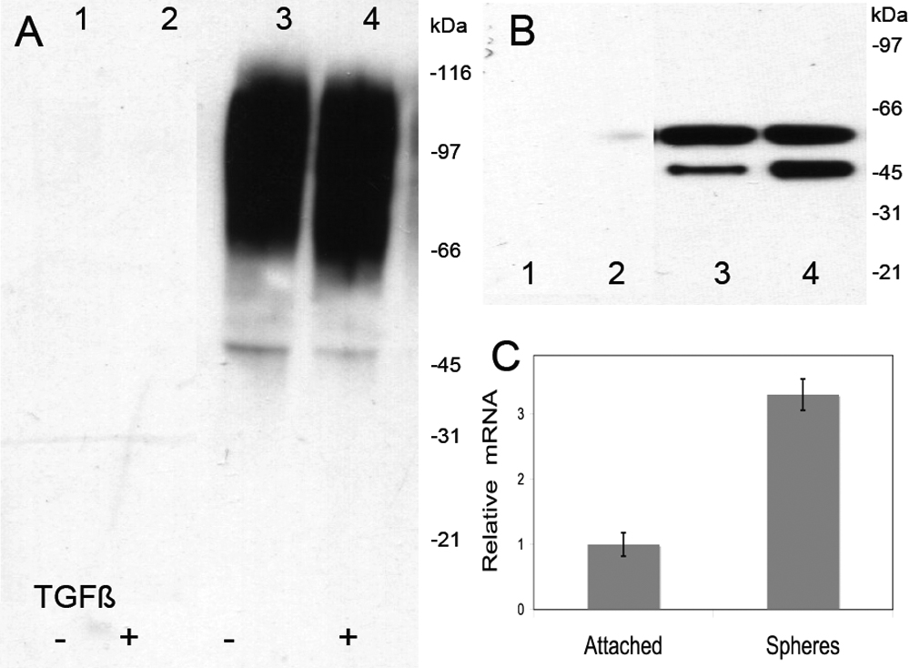 Figure 4. Production of keratan sulfate proteoglycans by spheroids. In A and B, primary keratocytes were cultured in Advanced-DMEM as attached cells (lanes 1 and 2) or as spheroids (lanes 3 and 4) in