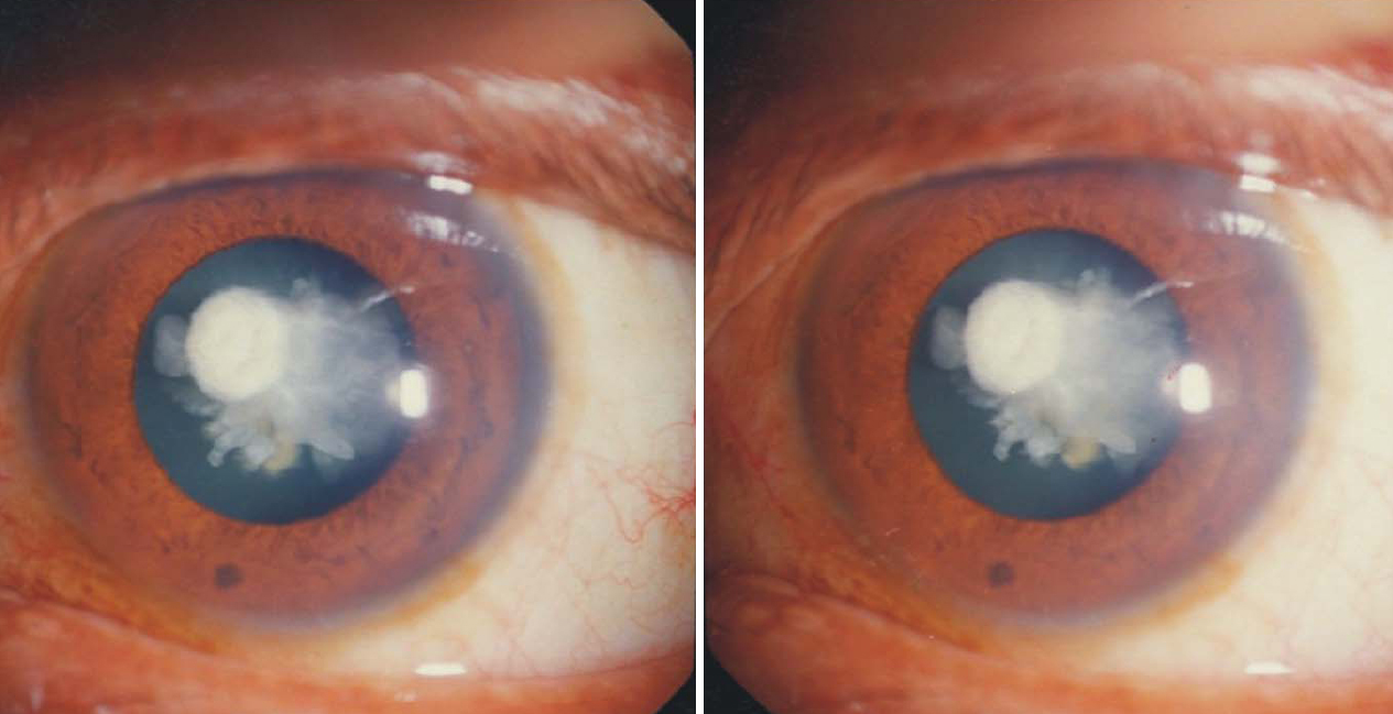 lens) of a patient taken through a slit lamp. The lens opacity is