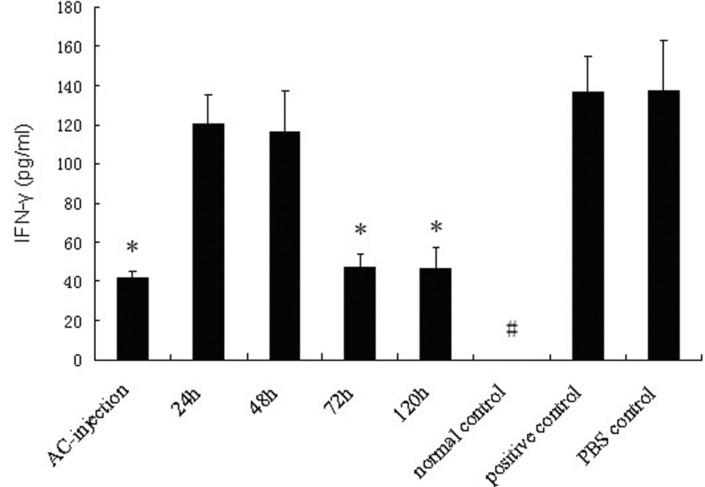 indicates that p<0.05 when compared with the positive control. The hash mark means that the production of IFN-γ was lower