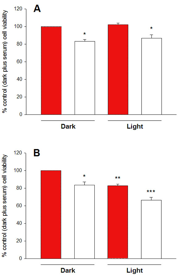 conditions in the presence (red bars) or absence (empty bars) of 10% (v/v) serum and in the presence or absence of light of