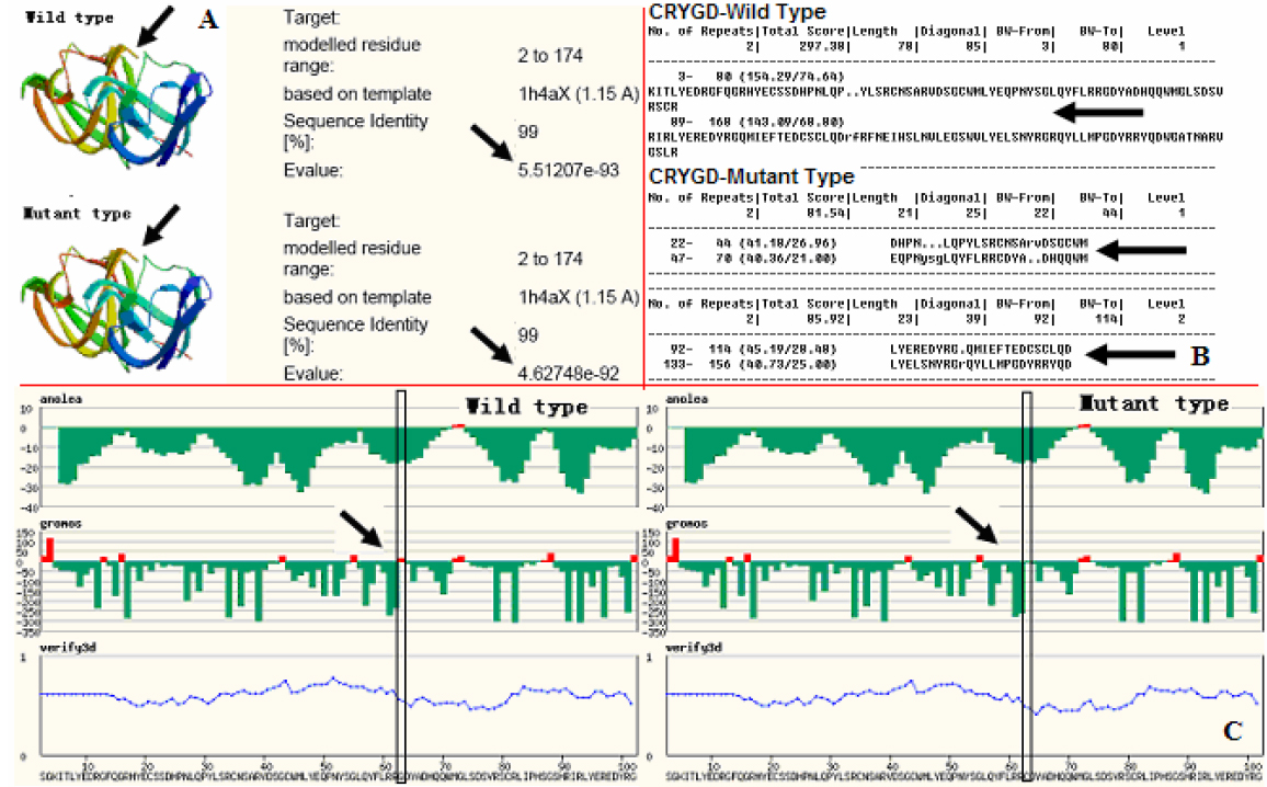 Figure 7. Using the online Radar software to predict the effect of the substitution in CRYGD. Effect on alignment of repeats in protein sequences is shown in B. The Swiss-model software (version 3.5) predicted that the P.G61C mutation exerted little effect on the tertiary structure