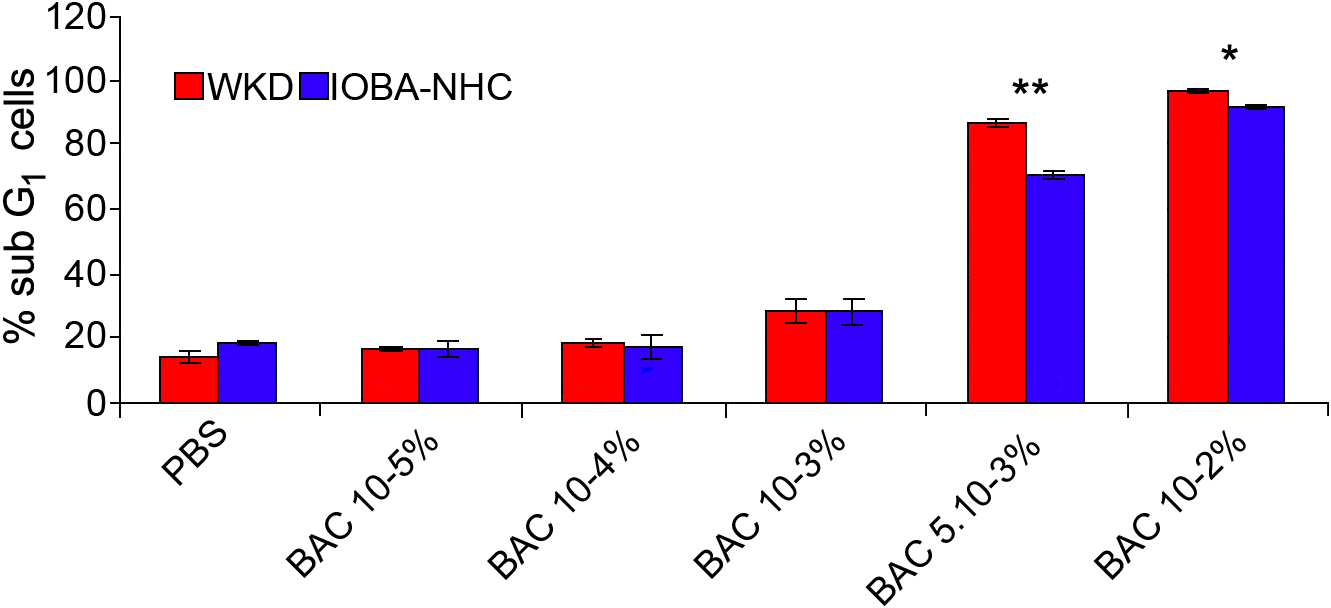 of BAC followed by 24 h of cell recovery. Note that the same toxicity profiles were obtained on both cell lines with BAC concentration-dependent