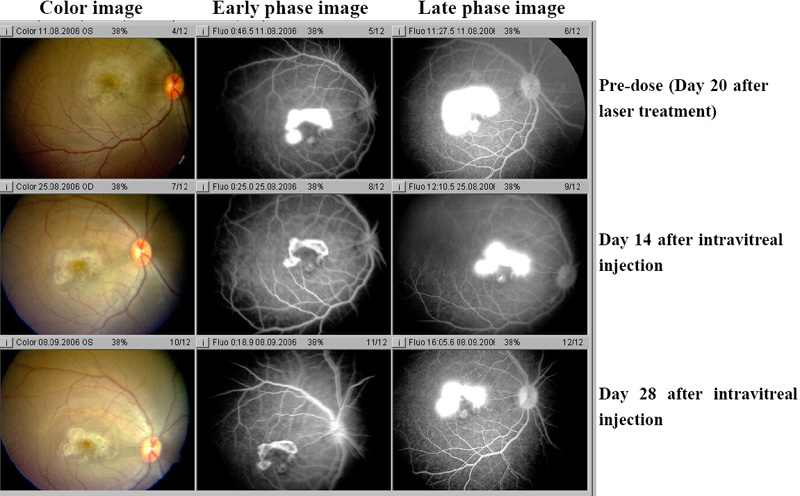 Figure 5. Color photography and angiography of an eye that received injection of 100 μg KH902 taken on day 20 after laser, days 14 and 28 after intravitreal injection
