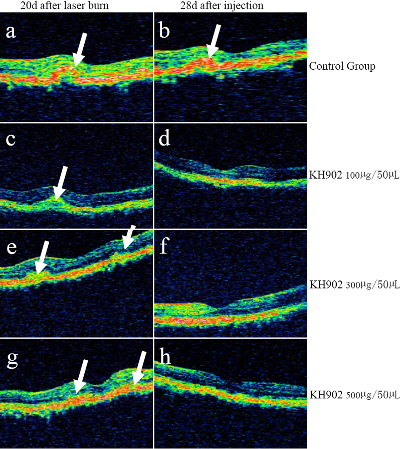 The high reflect light echogenic mass (white arrowheads) were detected in the eyes on day 20 after laser burn and in the eye of control on day 28 after intravitreal injection. The light echogenic mass disappeared after injection compared with that before injection. The light echogenic band of retinal pigment epithelial became regular and continuous. Edema of the retina faded away and the shape of the macula fovea centralis recovered.