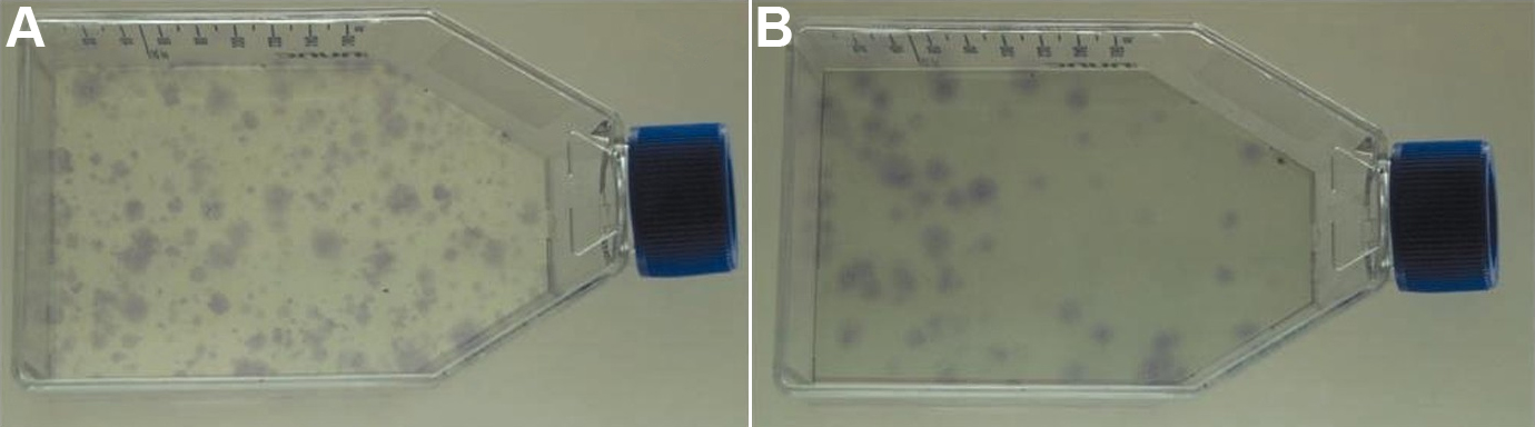 Colony Formation Unit (CFU) assay of MC-L and MSC-BM. The figure shows the crystal violet stained colonies of stromal cells – MC-L (
