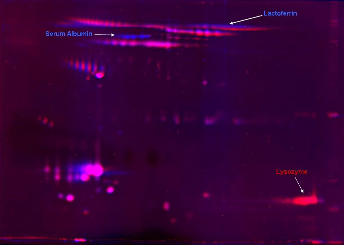 stained with SYPRO Ruby and overlaid to show the contrasting proteins