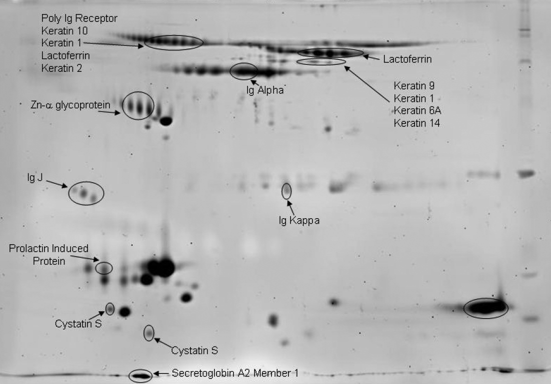 Eighteen-centimeter 2D-SDS–PAGE stained with SyproRuby of capillary-collected tears. The gel is labeled with subsequent protein identifications by nano-LC/MS/MS.