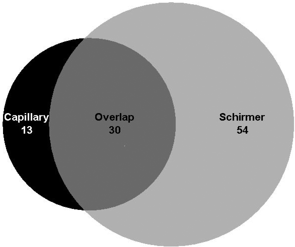 Venn diagram comparing the distribution envelope of proteins that were collected by capillary versus by Schirmer strip. The proteins were identified using GeLC-MS/MS and MudPIT.