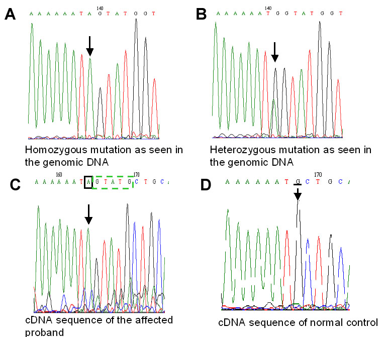by the arrow. C: cDNA sequence of the LCA5 gene of the affected proband with the mutated splice site. The black square box and the arrow indicate the mutated base.