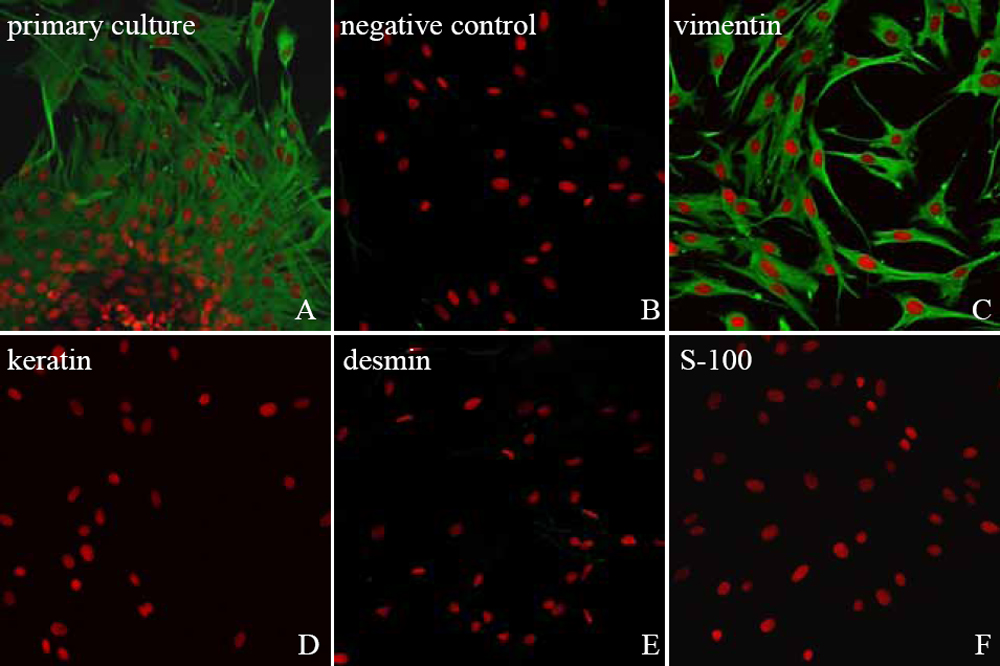 Figure 1. Identification of HSF with vimentin, keratin, desmin, and S-100. PI dyed the nucleus (red) and the FITC-marked secondary antibody