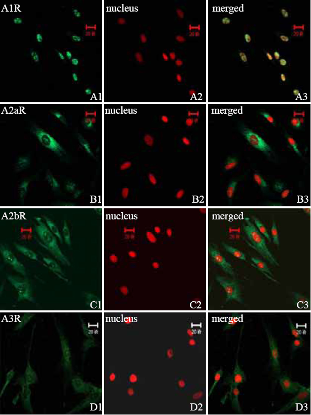 Figure 2. Distribution of ADORA1, ADORA2A, ADORA2B, and ADORA3 in HSF in vitro using indirect immunofluorescence. FITC-marked the secondary