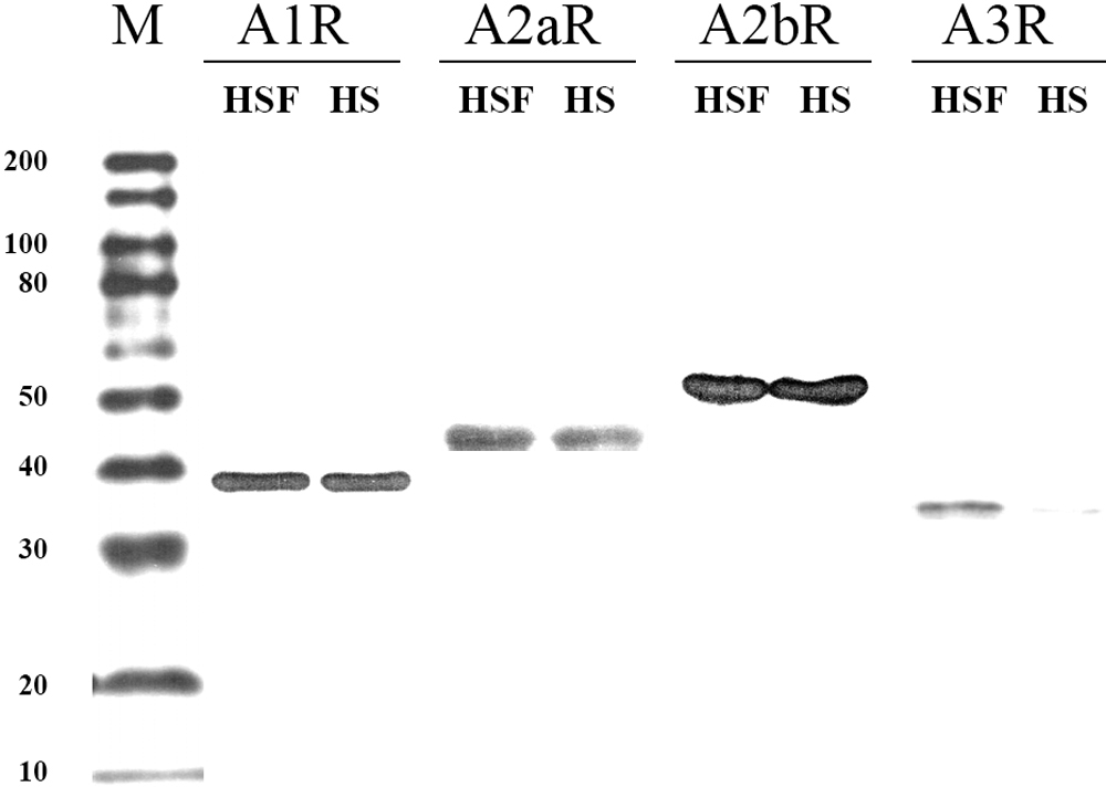kDa. The molecular weight of ADORA1 is about 39 kDa, ADORA2A is 45 kDa,