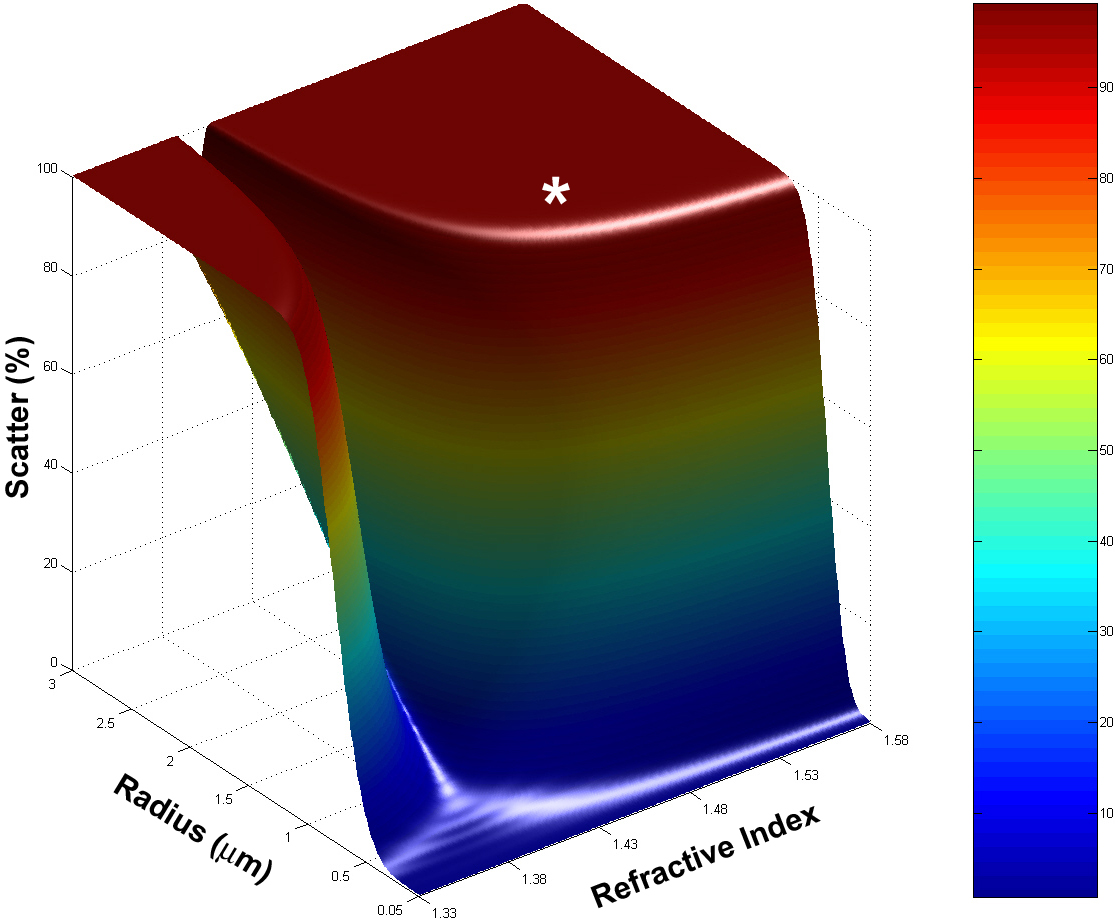 (white asterisk, representing 1.49 refractive index and 2.1 µm average diameter) for 550 nm wavelength light and variable