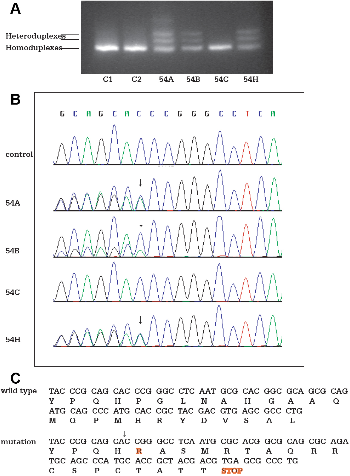 DNA samples are then sequenced for detection of sequence variants. A: Heteroduplexes detected by CSGE is shown. Lanes C1 and C2 represent the healthy controls; Lane 54A represents the proband;