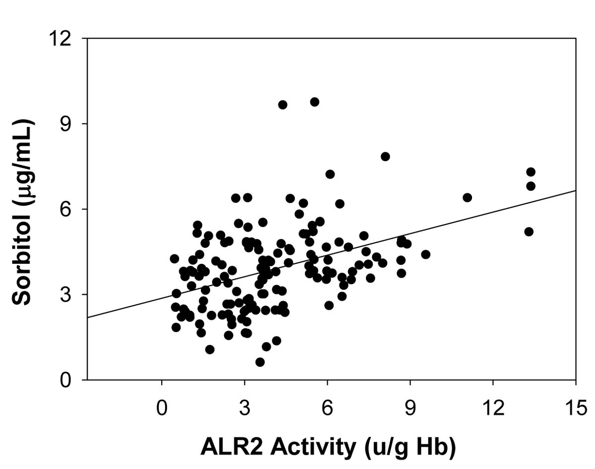 Figure 4. Correlation between erythrocyte sorbitol levels and aldose reductase activity. Correlation (r=0.188) between erythrocyte sorbitol